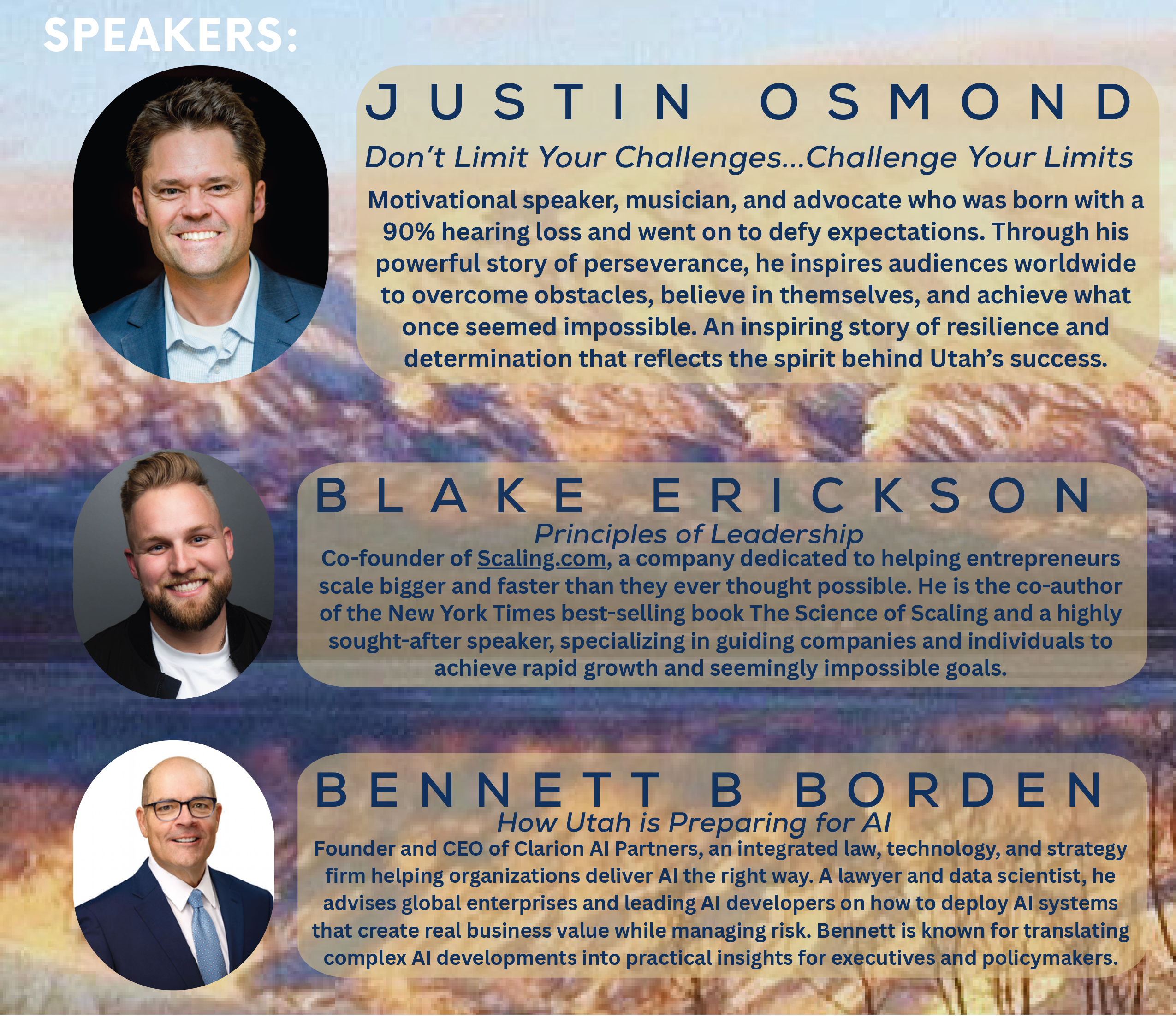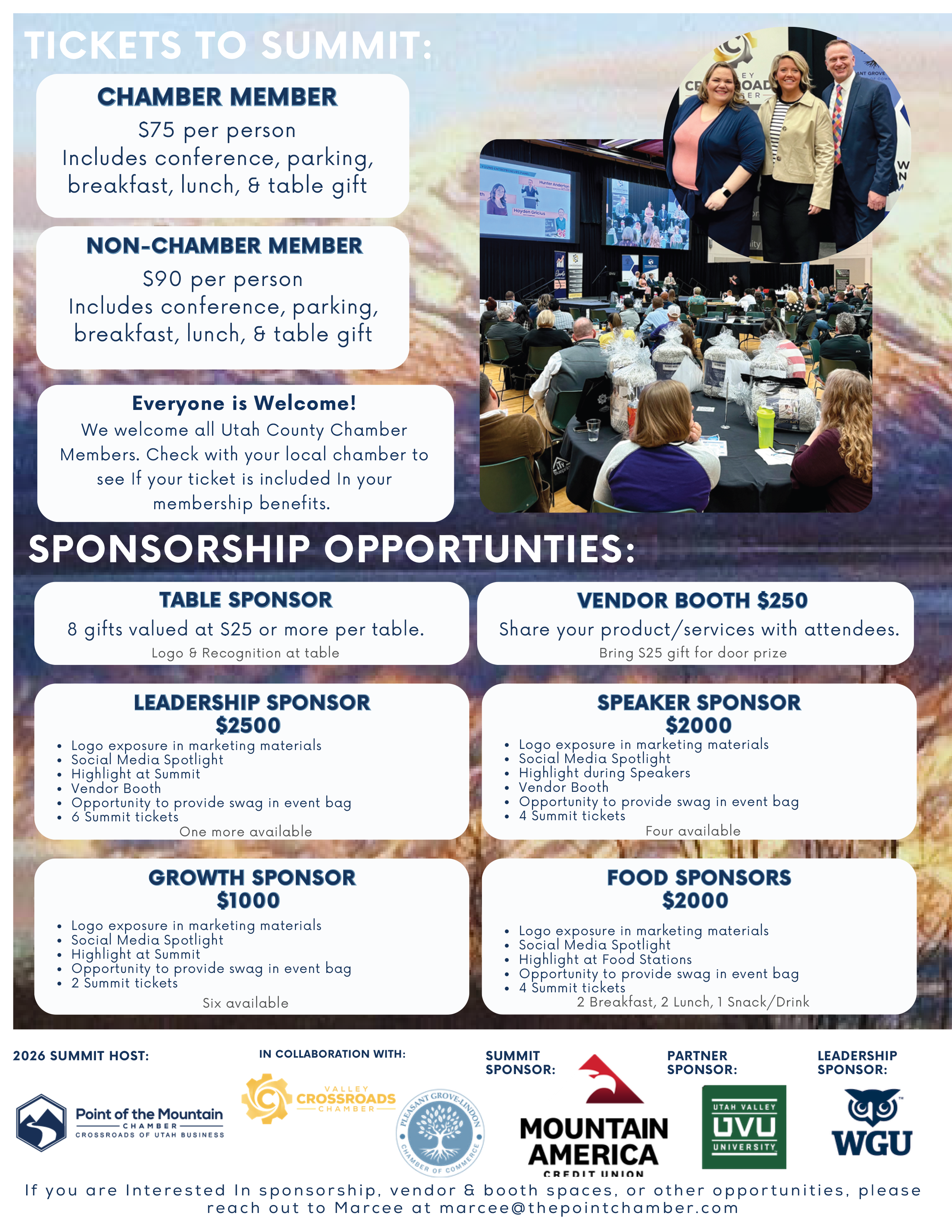 | 5/15/2026 | Since 2013, chambers across Utah County have partnered to host the Utah County Business Summit, a dynamic gathering that brings together nearly 200 business owners, leaders, and professionals for a day designed to spark ideas, build relationships, and fuel business growth. The Summit is a chance to step away from the daily grind and invest in your business, your leadership, and your network. Each year, the Summit features engaging speakers from a wide range of industries who deliver practical insights, fresh perspectives, and real-world strategies you can put to work immediately. Whether you're looking to grow your business, strengthen your leadership skills, or connect with other professionals who share your drive, the Utah County Business Summit delivers value you can feel. You’ll also have the opportunity to: