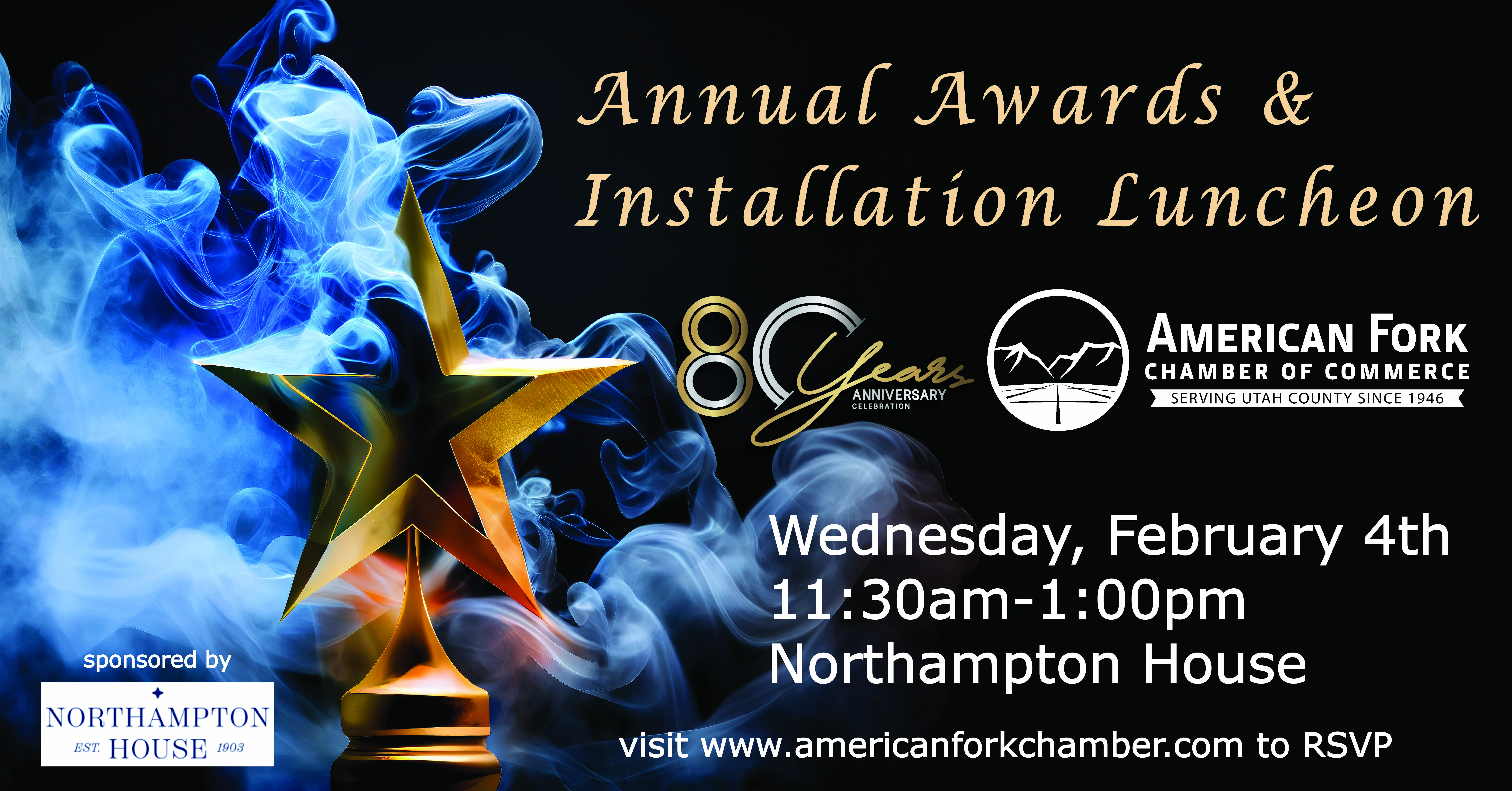 | 2/4/2026 | Join us for the American Fork Chamber of Commerce’s Annual Awards & Installation Luncheon, a signature event celebrating the businesses, leaders, and volunteers who help shape the Chamber and the communities that we serve. This year’s luncheon is especially meaningful as we commemorate the Chamber’s 80th Anniversary, honoring eight decades of service, leadership, and connection within our business community. Together, we’ll recognize outstanding achievements, reflect on the impact of the past year, thank our outgoing Board members, and formally install our incoming Board leadership. Enjoy an engaging program, meaningful recognition, and the opportunity to connect with fellow business and community leaders as we look ahead to the year to come. Special thanks to the Northampton House and Crisp Catering for providing the venue and catering the luncheon! Whether you are a longtime Chamber supporter or new to the community, this event is a powerful reminder of what we accomplish when business and community come together. more info... |