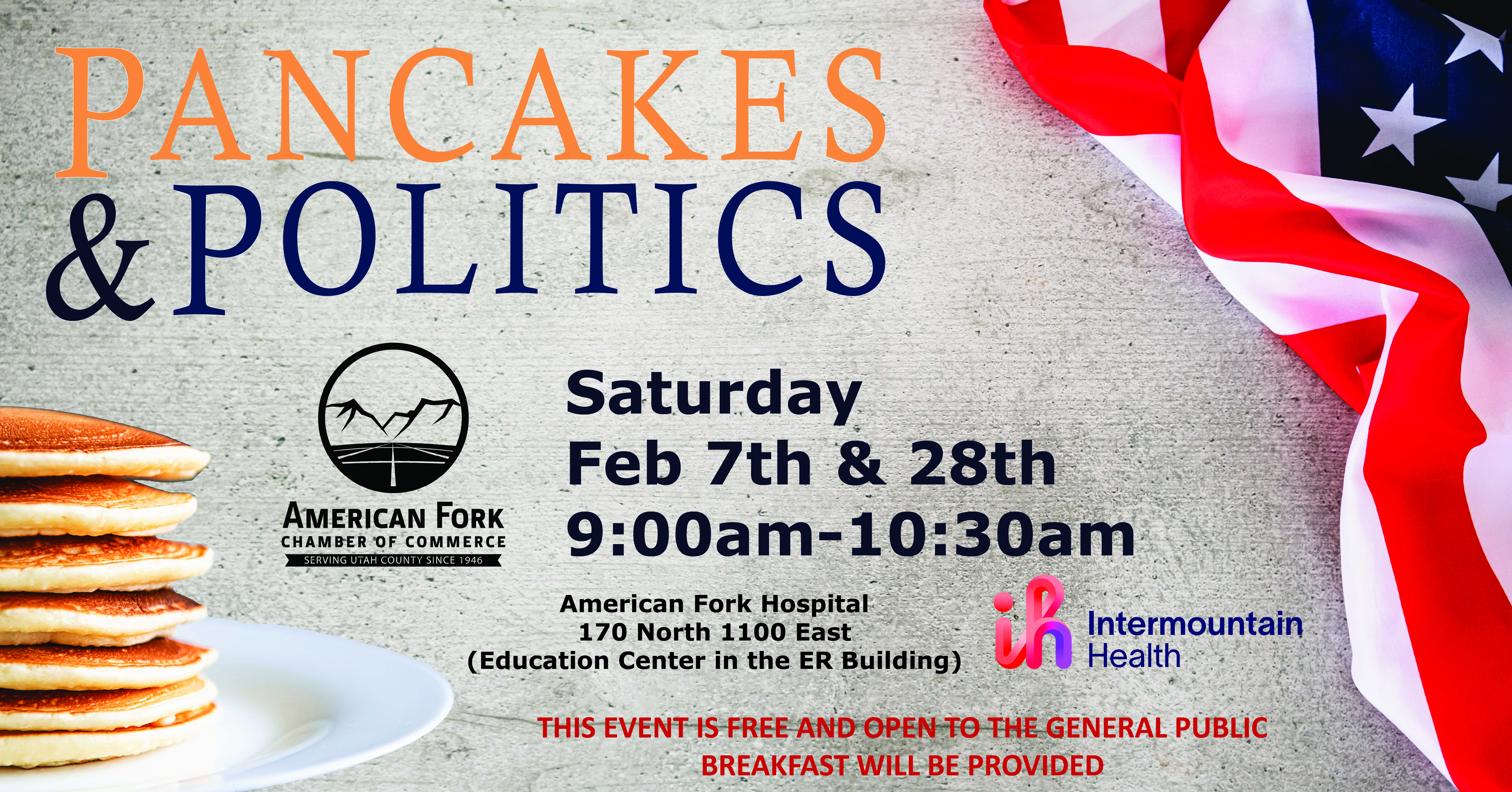 | 2/28/2026 | Start your morning with conversation, community, and civic engagement at Pancakes & Politics, hosted by the American Fork Chamber of Commerce and sponsored by Intermountain Health. This free, public forum offers an opportunity to hear directly from local and regional elected officials, candidates, and community leaders while enjoying a complimentary breakfast. Designed to encourage informed dialogue, Pancakes & Politics provides a welcoming space for attendees to learn more about key issues, ask questions, and better understand the perspectives shaping our community. Whether you’re a business owner, resident, or simply interested in local government, this event is an accessible way to stay engaged and informed. π₯ Breakfast will be provided This event is free and open to the general public. more info... |