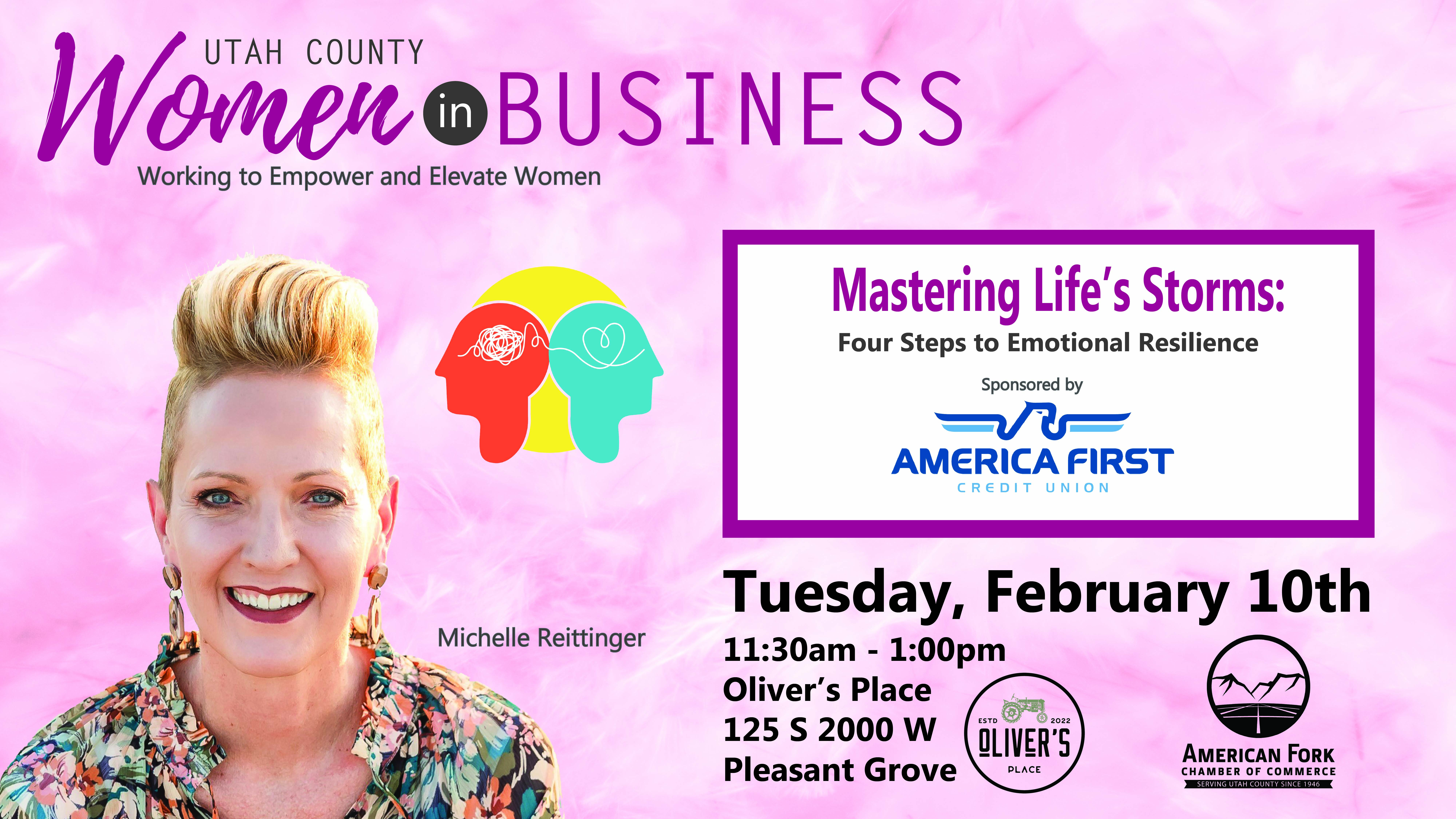 | 2/10/2026 | Join us for our February Utah County Women in Business luncheon as we welcome Michelle Reittinger, speaker, author, and mental health advocate, for an inspiring and deeply human conversation about resilience, both in life and in leadership. Drawing from her personal journey navigating mental health challenges while building a meaningful career and life, Michelle shares practical insights on how to face adversity with courage, clarity, and compassion. Her message is honest, relatable, and empowering, offering attendees tools to better understand themselves, navigate life’s storms, and show up more fully at work and at home. This session is designed to encourage reflection, connection, and growth, reminding us that resilience is not about perfection, but about learning how to move forward with strength and self-awareness. Whether you are navigating change, leading others, or simply looking to strengthen your emotional toolkit, this luncheon offers a supportive space to learn, connect, and be inspired. more info... |
